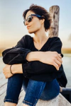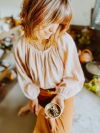 Manga de corte ranglan y efecto globo que termina en un pequeño puño con botón de nácar igual que el escote.