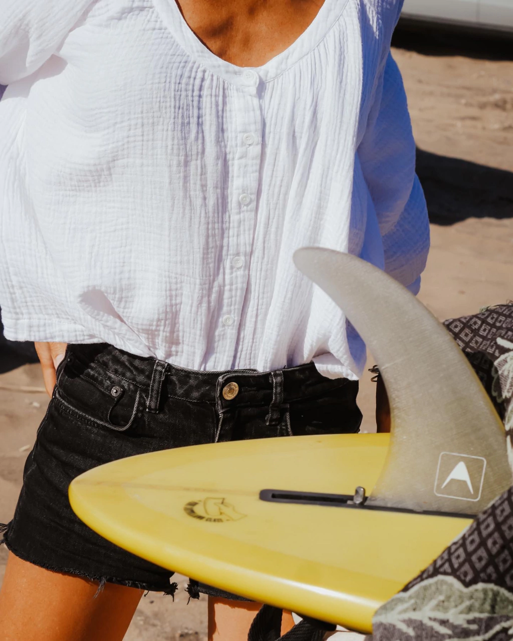 Camisa de cuerpo amplio y corto que se une en un sutil frunce a un cuello redondo escotado.