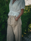 Confeccionado localmente en un género de aspecto rústico y arrugado, 100% algodón. De trama resistente y al mismo tiempo suave y agradable al tacto.