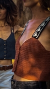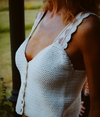Top corto tejido a crochet en algodón peinado, con botones de coco en la delantera.