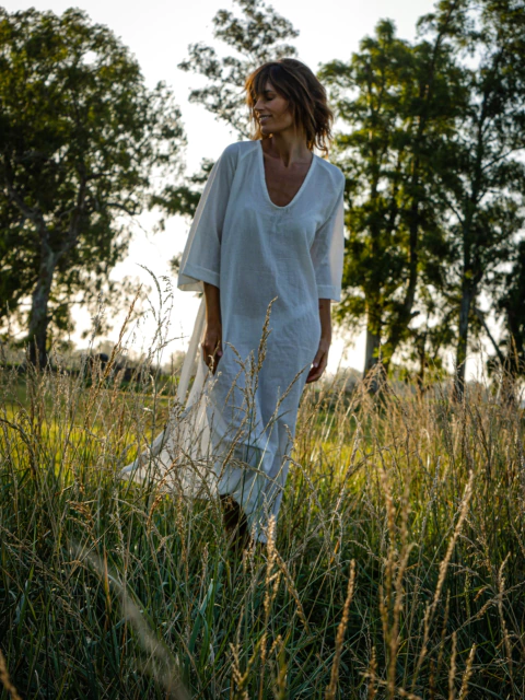 De corte simple y amplio. Cuerpo suelto con bolsillos ojal en los costados, tajos laterales y lazo para ajustar o marcar la cintura.