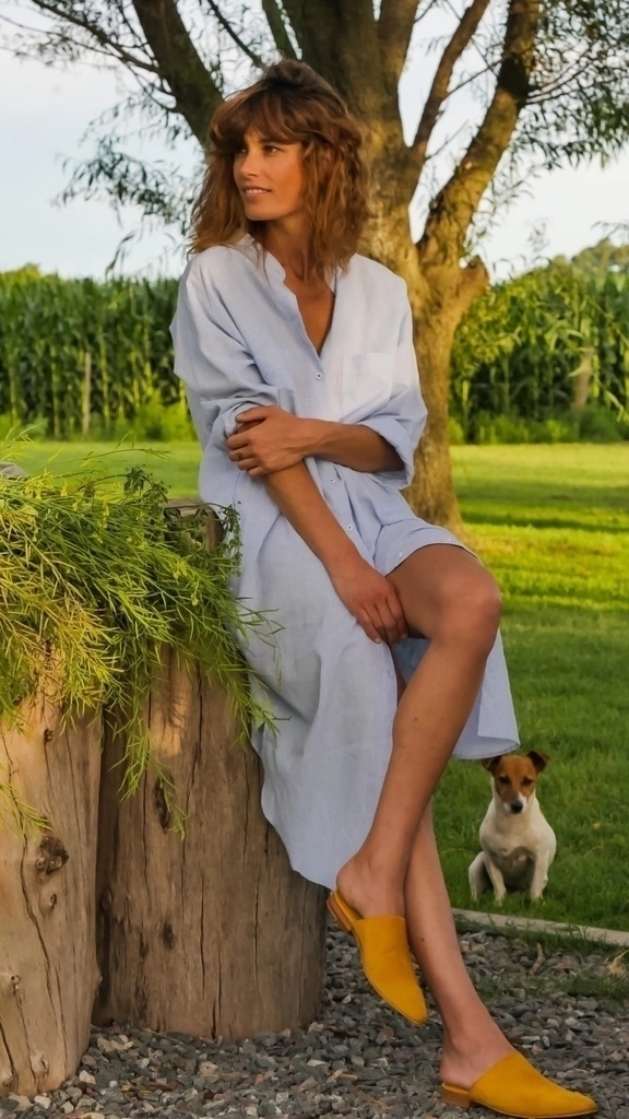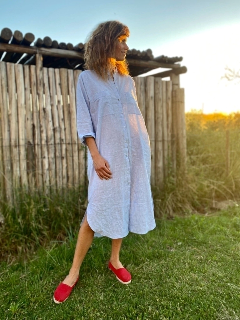 Viene en una única combinación de colores, que es la clásica raya finita blanca y celeste, un básico que nunca pasa de moda. Y en color beige liso.