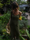 Canesú delantero doble bien al cuerpo, marcando la figura en busto y cintura, desde el cual sale la falda suelta a partir de sutiles frunces.